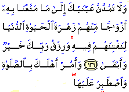 Do not turn your eyes covetously towards the embellishments of worldly life that We have bestowed upon various kinds of people to test them. But the clean provision bestowed upon you by your Lord is better and more enduring. Enjoin Prayer on your household and do keep observing it.