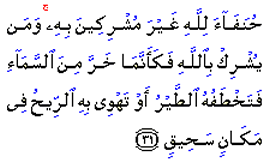 Whoso ascribes Divinity to aught beside Allah, it is as though he fell down from the sky whereafter either the birds will snatch him away, or the wind will sweep him to a distant place.