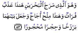 Commentary: This happens wherever a larger river flows into the sea. There are springs of sweet water at several locations in different seas where the sweet water remains separate from the salty water of the sea. Sayyidi Ali Rais, a Turkish admiral of the sixteenth century, mentions in his work, Mir'at al-Mamalik, one such place in the Persian Gulf. He writes that he found springs of sweet water under the salty water of the sea and drew drinking water from them for his fellow sailors. In more recent times, when the Arabian American Oil Company began drilling oil wells in Saudi Arabia, they used the water of the same springs of the Persian Gulf as drinking water until the wells in the vicinity of Dahran were dug. Also, near Bahrain, there are springs of sweet water under the sea from which people have drawn upon for ages. This verse identifies this wondrous manifestation of God's omnipotence as a evidence of His Oneness. But there is an additional, albeit more subtle, meaning implicit in the verse too. No matter how bitter and salty the ocean of human society may become, God can always produce a righteous group of people in the same manner that He can produce a spring of sweet water in the depths of a salty ocean. This spring of sweet water cannot be gulped down by the waves of salty water no matter what. [Compiled from "Towards Understanding the Quran" by Sayyid Abul Ala Mawdudi, Vol 7, pp. 32, 33] |