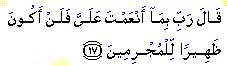 Al-Qasas (The Narration) The favour alluded here consists of God concealing Moses', peace be upon him, act of killing and of His enabling him to escape. Moses' pledge not only means that he would never lend any assistance to the guilty, but also that his help and assistance would never be for the perpetrators of insjustice and tyranny. Zamakhshari and many other Quranic commentators have taken these words to mean that, on that very day, Moses decided to sever his relations with Pharaoh and his government because it was a tyrannical government which had established an unjust rule over God's land. Muslim scholars have deduced from Moses' pledge that a believer should shun helping a tyrant, regardless of whether that tyrant is a person, a group, or a government. Someone asked Ata ibn Abi Rabah, a well-known Successor (Tabi'i): "My brother is a scribe to the governor of Kufah under the Umayyads. Though he does not judge the disputes of people, the judgements are written by his pen. If he does not have the job, he will become penniless." Ata at this point recited this verse, saying: "It is better for your brother to throw away his pen for it is God Who provides livelihood." Source: |