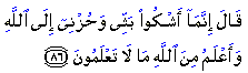 (Joseph) Man needs to obtain his provision and other needs, and to protect himself from harm. In both cases, he should call on Allah. He should not ask for provision from anyone other than Allah, and he should not complain to anyone other than Allah. In the Quran, Allah has mentioned goodly forsaking, goodly forgiveness and goodly patience. It was said that goodly forsaking is to forsake or boycott without doing harm; goodly forgiveness is to forgive without rebuking; and good patience is to be patient without complaining to any other person or created being. When Ahmad ibn Hanbal was sick, he was told that Tawus used to hate the sound of a sick person's groaning, and would say, "this is a complaint," so Ahmad never groaned until the day he died. Complaining to the creator, on the other hand, does not contradict the idea of goodly patience. For Yaqub said: "Patience is most fitting (for me)" [Yusuf 12:83], but he also said, "I only complain of my distraction and anguish to Allah ..." Umar ibn al-Khattab used to recite Surahs Yunus, Yusuf and al-Nahl during Fajr prayer. When he reached this ayah. he wept so much that his sobs could be heard in the last rows of the congregation. Musa used to pray: "O Allah, to You be all praise and to You (alone) do I complain. You are the (only) One Whom I ask for help, in You I seek refuge and upon You I rely. There is no strength or power except you." Source: |