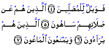 Forgetfulness in prayer 1. Forgetfulness implies abandoning, and that can be either intentional or unintentional. If it is intentional, that is deliberate; if it is unintentional, it is forgetfulness (sahw) for which there is no responsibility. 2. It is impossible for the forgetful person to be responsible because he does not understand the requirement. If the person had an intention to leave the prayer, he is censured when the time of the prayer comes, whether if he was heedless at that actual moment or if it is simply his habit to omit it. This does not include the one who overlooks something in his prayer. 3. It is impossible to be completely free of forgetfulness. The Prophet, may Allah bless him and grant him peace, forgot in his prayer as did the Companions. If someone does not ever forget in his prayer, this could be an indication that the person does not reflect and understand his recitation. His concern is only for the number of rakats. The only thing that made the Prophet forget in his prayer was reflecting on what was greater than it. Those who show off Ibn Wahb said that Malik said that these are the hypocrites who make a show of their prayer. A hypocrite shows people that he is praying in obedience to Allah, but he is praying out of taqiyya (dissimulation). A fasiq prays so that he will be accepted as someone who prays. The reality of riya (show off) is to seek this world by worship. Its basis is to seek to enjoy a position in people's hearts. The beginning of it is good reputation, and he desires to obtain rank and praise by that. The second level is showing off by wearing short clothes and coarse clothes to give an appearance of asceticism in this world. The third is to show off by verbal expression by displaying anger against the people of this world and admonition while he actually regrets not having wealth and their worship. The fourth is making a public display of the prayer and sadaqa or making the prayer appear good so that people will see it. It is also making the prayer long. Denying help to others Maun is derived from the verb help (a'ana). It means to assist with strength, tools and means to make something easy. Some scholars have considered Maun to exclusively refer to Zakat, like Imam Malik. Yet, others like ibn Abbas (may Allah be pleased with him) considers this to be in reference to what one individual lends to another. Source: |
