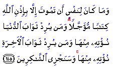 The purpose of this directive is to bring home to the Muslims that it would be futile for them to try to flee from death. No one can either die before or survive the moment determined for death by God. Hence one should not waste one's time thinking how to excape death. Instead one should take stock of one's activities and see whether one's efforts have either been directed merely to one's well-being in this world or to well-being in the Hereafter. The word 'thawab' denotes recompense and reward. From the Islamic point of view, the crucial question bearing upon human morals is whether a man keeps his attention focused on the worldly results of his endeavours or on the results which will acrue to him in the Next World. The 'ones who are grateful' are those who fully appreciate God's favour in making the true religion available to them, and thereby intimating to them knowledge of a realm that is infinitely vaster than this world. Such people appreciate that God has graciously informed them of the truth so that the consequences of human endeavour are not confined to the brief span of earthly life but cover a vast expense, embracing both the present life and the much more important life of the Hereafter. He does so even though he may sometimes find that, far from bearing fruit, righteousness leads to privation and suffering in this world. Source: |