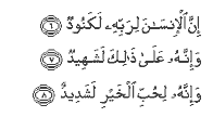 It is a fact that man reacts with ingratitude to all the bounties of his Lord. He denies the favours which God confers on him. His thanklessness and ingratitude is reflected in a host of actions and verbal statements which will serve as witness against him. Or perhaps, on the Day of Judgement, he may testify against himself, admitting his ingratitude: "and to this he himself bears witness." (Verse 7) For on the Day of Judgement he will speak the plain truth even against himself, without contention or excuse. "And truly, he is passionate in his love for wealth." (Verse 8) Man is a passionate self-lover. But he loves only what he imagines to be good for himself: wealth, power and the pleasures of this world. This is his nature unless he has faith which changes his concepts, values and even his concerns. Faith changes his ingratitude to humble thankfulness. It changes his greed and miserliness to benevolence and compassion. It makes him aware of the proper values which are worthy of being the object of ambition and hard competition. Indeed these are much more exalted than money, power and mundane pleasures. Man without faith is an ignoble creature having only trivial ambitions and petty concerns. However large his desires, however strong his ambitions and high his objectives may seem, he remains sunk in the cesspool of this earth, confined within the limits of this life, imprisoned in self. He cannot be freed or elevated except by an attachment to a world superior to this earth, extending beyond this life; a world which originates from God who is the First Being and returning to God the Eternal; a world into which this life and the life hereafter converge and which has no end. Source: |