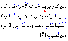 Both the seeker of the Hereafter and the seeker of the world have been likened to the farmer in this verse, who labours hard persistently right from the time he prepares the soil till the time his crop is ready for harvesting. He puts in all his labour so that he may reap and gather the crop of the seeds he sowed. But because of the difference of the intention and objective and also the difference of the attitude and conduct, to a large extent, a vast difference takes place between the farmer who sows for the Hereafter and the farmer who sows for this world. Therefore, Allah has ordained different results and consequences of the labours of each, although the place of activity of both is this very earth. As to the farmer who is sowing for the Hereafter, Allah has not said that he will get no share from the world. The world, in a more or less measure, he will get in any case. For he also has a share in the common provisions being bestowed by Allah, and every person, good or bad, is getting his sustenance here. But Allah has not given him the good news of the harvest of this world. He has given him the good news that his harvest of the Hereafter will be increased, for he is a seeker of the hereafter, and is concerned about his end there. There are several ways in which this harvest can be increased; for example, as he goes on doing righteous deeds with sincere mentions, he is blessed with the grace to do more and more righteous deeds and his breast opens out for more and more good deeds. Above all, his good works, however small and insignificant, will at least be increased ten times over in the Hereafter, and there is no limit to this increase. Allah will increase it hundreds of thousands of times for whomever He may please. As for the one who is only sowing for this world, and is not at all concerned about the Hereafter, Allah has plainly told him of two of the results of his labours: (1) That, however hard he may struggle and strive. he will not get the whole of what he is trying for, but only a fraction of it, which Allah has ordained for him; and (2) that whatever he gets, he will get only in this world: there is no share for him in the good things of the Hereafter. Source: |