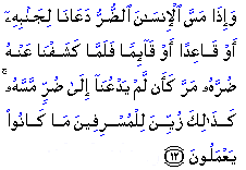 "And (such is a man that) when an affliction (difficulty) befalls him, he cries out to Us, reclining and sitting and standing. But no sooner than We have removed his affliction, he carries on as if he had never cried out to Us to remove his affliction. Thus this is the way the misdeeds of the transgressors are made fair-seeming to them."