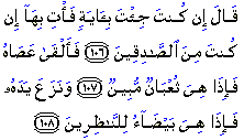 "(Fir'aun) said: "If indeed thou hast come with a Sign, show it forth, if thou tellest the truth." Then (Musa) threw his rod, and behold! it was a serpent, plain (for all to see)! And he drew out his hand, and behold! it was white to all beholders!"