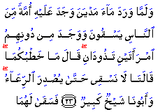 "And when he arrived at the watering (place) in Madyan, he found there a group of men watering (their flocks), and besides them he found two women who were keeping back (their flocks). He said: "What is the matter with you?" They said: "We cannot water (our flocks) until the shepherds take back (their flocks): And our father is a very old man." So he watered (their flocks) for them."