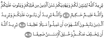 "Allah desires to make clear to you and to guide you to the ways of the [righteous] people before you and to turn to you in mercy; and Allah is all-Knowing, Wise. And Allah desires to lighten your burden, for the human being was created weak."