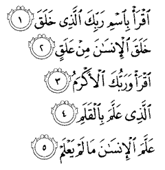 "Read. In the name of your Lord who created, created man from a clot of blood. Read. Your Lord is the most Bounteous, who has taught the use of the pen; has taught man that which he did not know."