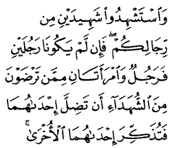 "... And bring to witness two witnesses from among your men. And if there are not two men [available], then a man and two women from those whom you accept as witnesses - so that if one of the women errs, then the other can remind her ... "