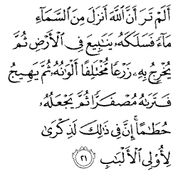 "Have you not considered how God sends down water from the skies, and then causes it to travel through the earth to form springs? He then brings with it vegetation of different colours; and then it withers and you can see it turning yellow. In the end He causes it to crumble to dust. In all this there is indeed a reminder for those endowed with insight."