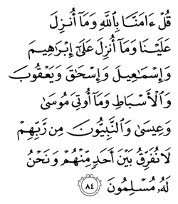 "We believe in God, and in that which has been revealed to us, which is that which was revealed to Abraham and Ismail and Jacob and the tribes [of Israel], as well as that which the Lord revealed to Moses and to Jesus and to all the other Prophets. We make no distinction between any of them; we submit ourselves to God."