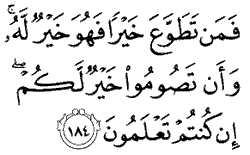 Fasting involves hardship. The word used for doing 'much more' is tatawwu, which has the connotation of spontaneously doing good. It also means acting with effort. These two ideas are also connected with fasting itself: it is both an instinctively good act and one that requires effort. The last part of the verse seems to acknowledge the fact that fasting requires serious effort. The idea of effort in all forms of Muslim worship is crucial. It suggests that as individuals and communities Muslims should inculcate the notion that serious effort is essential for genuine spiritual attainment.
