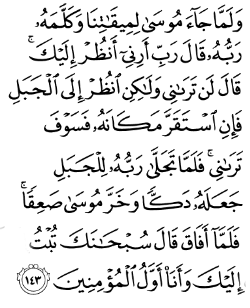 "And when Moses came to Our appointed meeting and his Lord spoke unto him, he said, 'My Lord, show me, that I might look upon Thee.' He said, 'Thou shalt not see Me; but look upon the mountain: if it remains firm in its place, then thou wilt see Me.' And when his Lord manifested Himself to the mountain, He made it crumble to dust, and Moses fell down in a swoon. And when he recovered, he said, 'Glory be to Thee! I turn unto Thee in repentance, and I am the first of the believers.'"