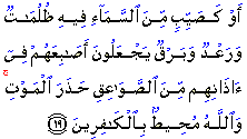 "Or like a rainstorm [sayyib] from the sky where there is darkness, thunder and lightning. They put thier fingers in their ears by reason of the thunderclaps for fear of death. And God encompasses the non-believers."