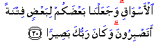 "We have made some of you as trials for others. Will you have patience? For Allah is One Who see" (all things)."